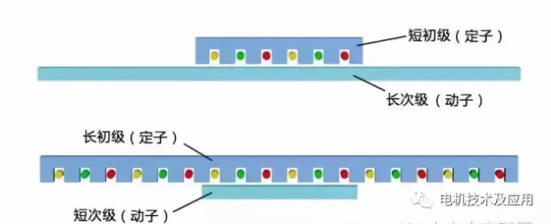 这时初级要做得很长,延伸到运动所需要达到的位置,而次级则不需要那么长,实际上,直线电机既可以把初级做得很长,也可以把次级做得很长;既可以初级固定、次级移动,也可以次级固定、初级移动。