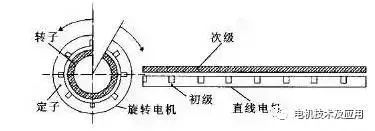扁平型电机可以看作是由普通的旋转异步电动机直接演变而来的。图1左图表示一台旋转的感应电动机,设想将它沿径向剖开,并将定、转子圆周展成直线,如图1右图,这就得到了最简单的平板型直线感应电机。 在旋转电机中转子是绕轴做旋转运动的,见绿色箭头线;在直线电机中动子是做直线移动的,见绿色箭头线。