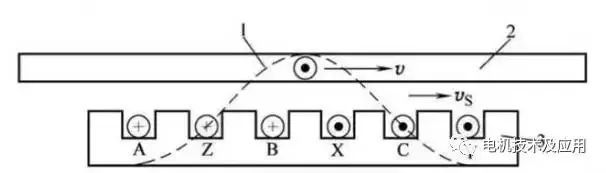 行波磁场切割二次侧导条,将在导条中产生感应电动势和电流,导条的电流和气隙磁场相互作用,产生切向电磁力。如果一次侧固定不动,则二次侧便在这个电磁力的作用下,顺着行波磁场的移动方向作直线运动。若二次侧移动的速度用v表示,转差率用s表示,则有